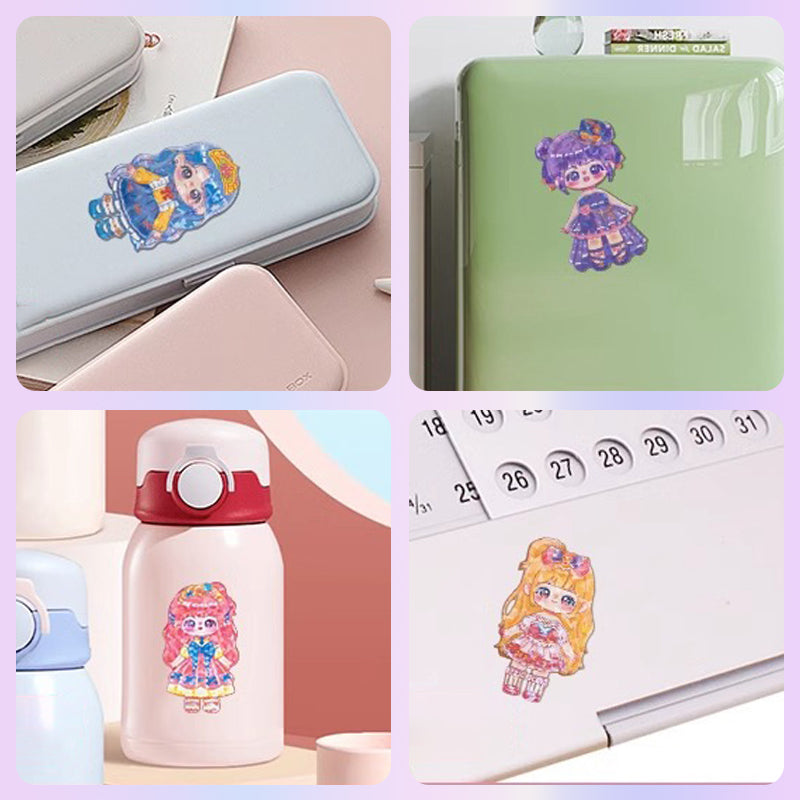 KIRKAS, ELÄVÄ JA MONIPUOLINEN MUOTOILU: Laserpinnoitetut magneettiset tarrat kirkkailla ja eloisilla väreillä tarjoavat visuaalista vetovoimaa. Nämä monipuoliset tarrat voidaan kiinnittää pintoihin, kuten jääkaappiin, penaaliin tai termospulloon, hauskanpitoa varten liikkeellä ollessa.